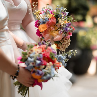 Hand-tied posies for the wedding party, each one highlighting a different spring bloom. Both brides had their friends choose attire in varied, warm tones, so having each of them carry bright arrangements of a single type of bloom was a perfect way to tie it all together while giving each friend their own special look.